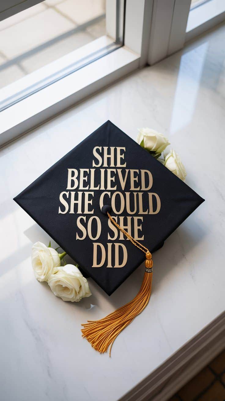 Choose quality materials and clean lines. Simple gold script on a black background? Eternal. Sometimes the most sophisticated graduation cap designs are the ones that don’t try too hard.